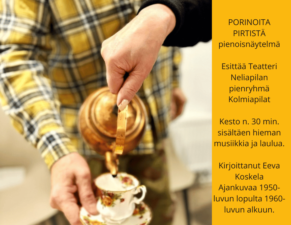 Pienryhmä esittää näytelmää Porinoita Pirtistä, joka perustuu käsikirjoittajan, Eeva Koskelan, 103-vuotiaan äidin muistelmiin. Muistelmat sijoittuvat 1950-luvun lopulle ja 1960-luvun alkuun. Esitys on herättänyt katsojissa muistoja ja keskusteluja menneiltä ajoilta. Tässä on mahtava tilaisuus saada teatteria sinne, missä kenties sitä ei muutoin näe.